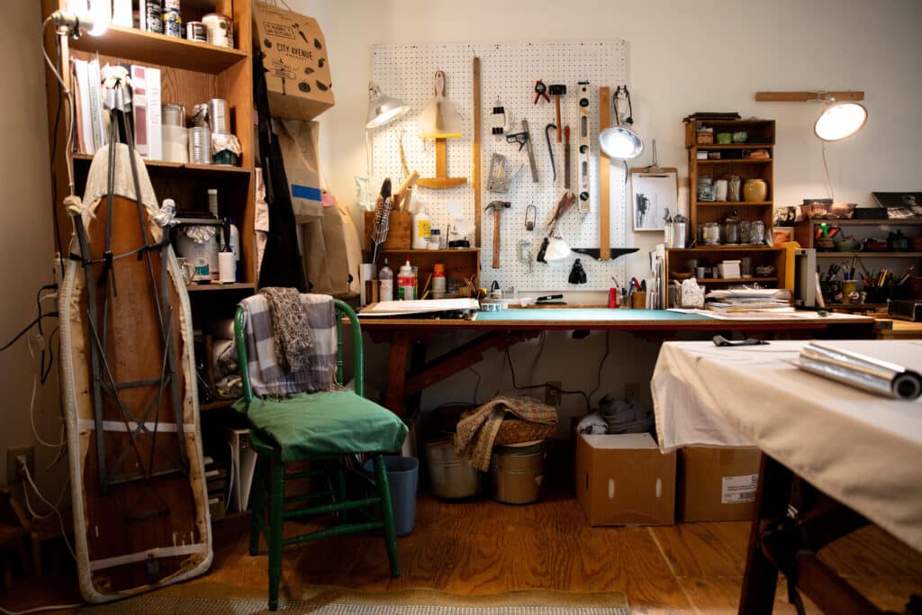 “There was a point where I thought I was simply cleaning up the mess behind our wood pile,” she says. “Then I’m resuscitating things and seeing a possibility of art happening. Then I’m throwing it all away too. I am not one to analyze too far toward the reason behind what I am physically doing.”