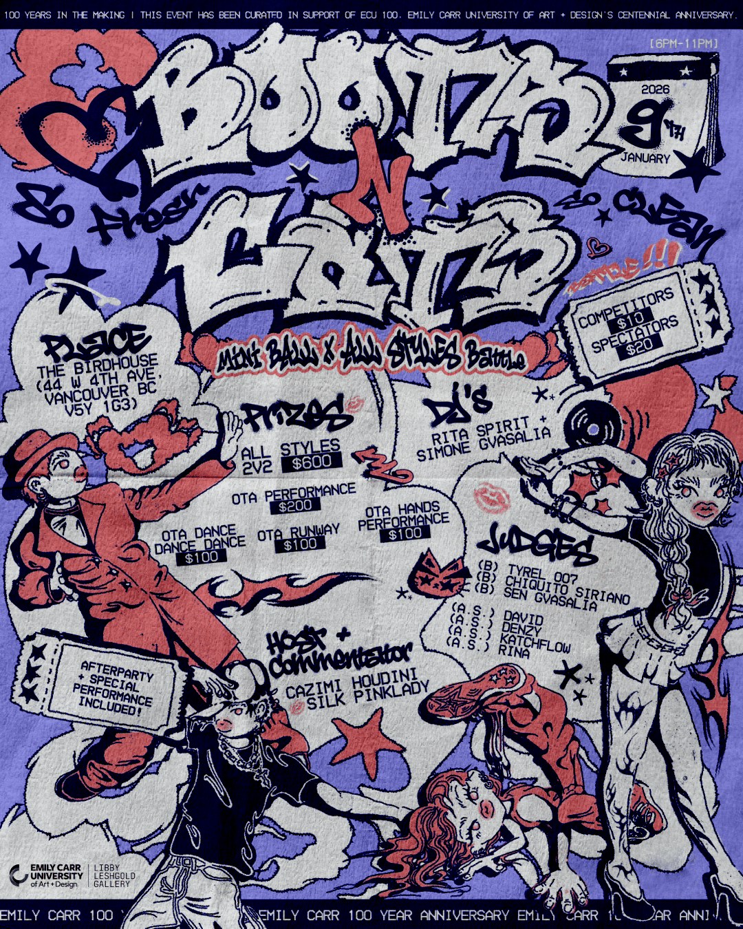 Merging performance, sound/music and celebration to bridge the vibrant local communities of Ballroom and Hip Hop/Street Dance. This evening brings these forms into dialogue, the event highlights their shared spirit of resilience, artistry and community, calling in future, present and past Emily Carr alumni alongside the wider community, the event expands what performance can be within the contemporary art context. Positioning Ballroom and Street Dance as not only cultural practices but as vital, living art forms that challenge and reimagine how performance enters and transforms institutional spaces.